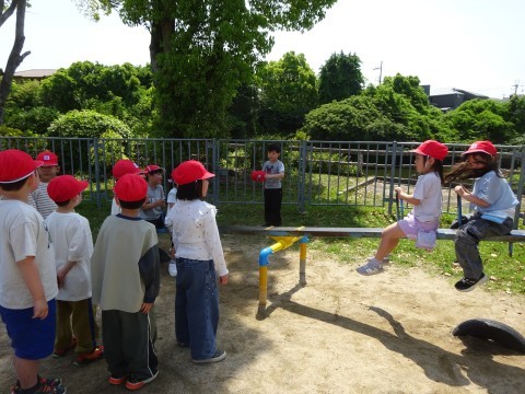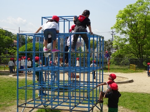 ジャングルジム,すべり台,シーソーで遊んでいます。
