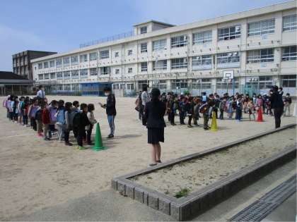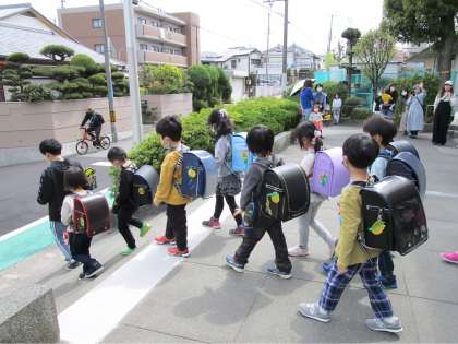 しばらくは1年生は集団下校をします。みどり・きいろ・あかのコースに分かれて帰ります。
