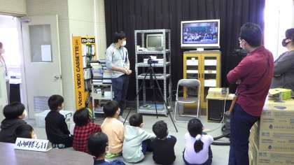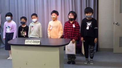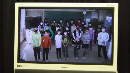2年生から6年生の各学級で制作した1年生へのメッセージビデオの放送を集まっていた1年生の代表と2年生の代表が見ました。