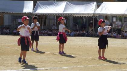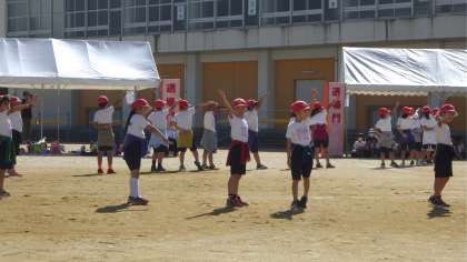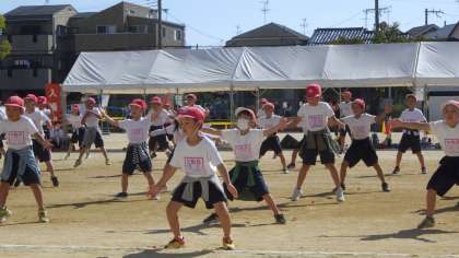 「強くなりたい」のダンスです。細かく素早い動きや大きな隊形移動と腰に巻いたシャツの小道具を使ったダンスが見どころでした。練習通りしっかり踊ることができました。