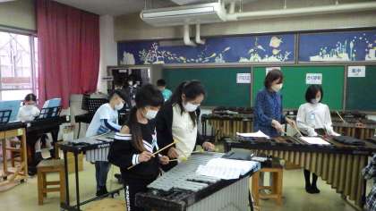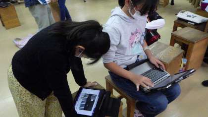 合奏の練習風景です。分からないときはタブレットで担当パートの演奏について調べてから練習しています。