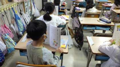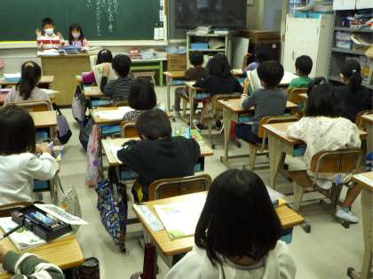 係の児童が前で合図をしてみんなで教科書を読んでいました。