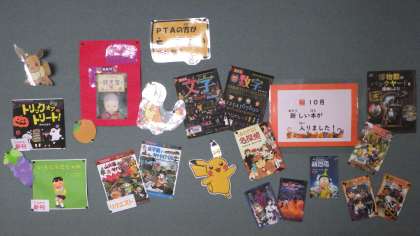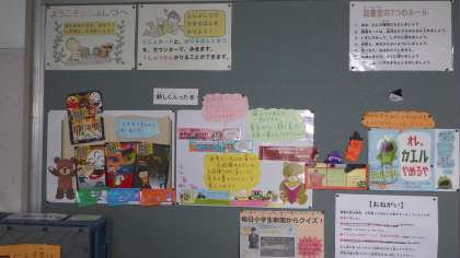 図書室の前には,楽しい本の紹介がたくさん掲示されています。それをめあてに本を探す児童もいます。たくさん本を読んでください。