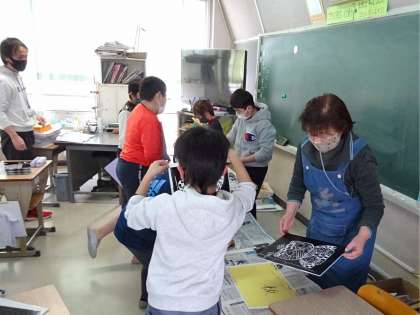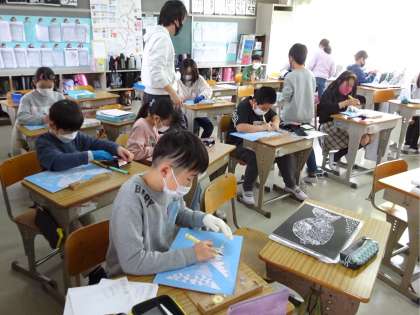 版画も彫りが終わった児童は刷りまで進んでいます。