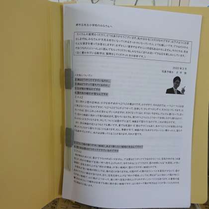 11月に来ていただいてお天気のお話をしてくださった気象予報士の片平さんから全学級に一言入ったサイン色紙と子どもたちがした質問に対する答えをまとめた冊子をいただきました。子どもたちも喜んでいます。片平さん,ありがとうございました。