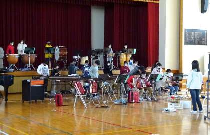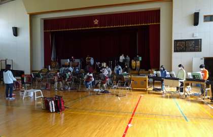 体育館に楽器を運び込んでの練習風景です。