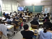 クラスごとに3つの場所を順番に見学したり体験したりしていきました。写真は、堺市博物館の展示を見学している様子です。