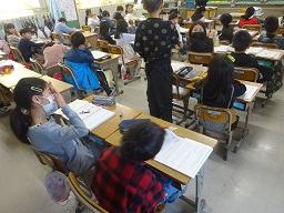 国語では、文の組み立てを考えて、発表用の原稿を作成しています。