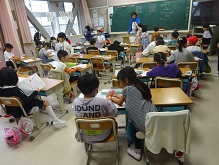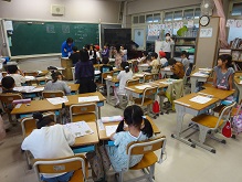 国語でひらがなの練習をしています。ワークシートに丁寧に書けた子どもから順番に、先生に〇をつけてもらいに行っています。これからもずっと、字は丁寧に書くようにしましょうね。