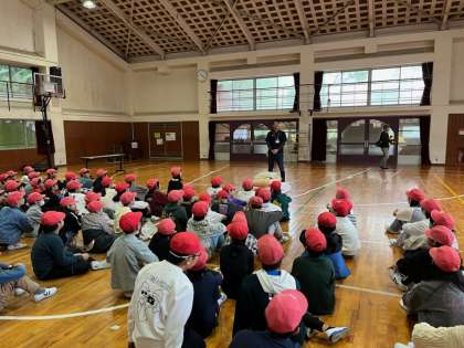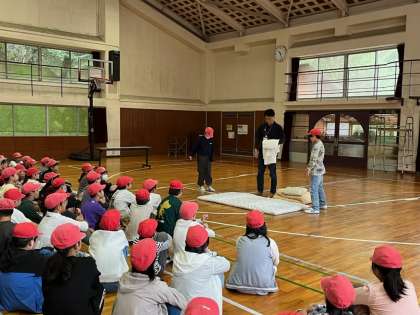 無事に到着しました。入所式で、施設の方からの説明を聞いています。