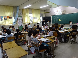 2年生の算数、かけ算の学習をしているところです。友だちが教室の前で考え方の説明をしています。
