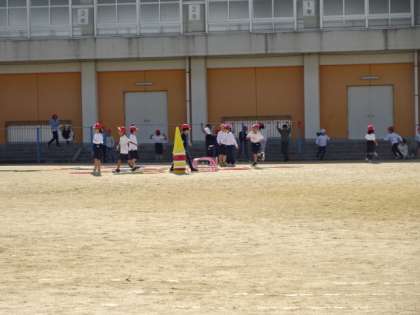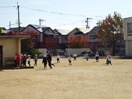 先生と一緒に鬼ごっこをしたり、体育の準備をしたりしています。