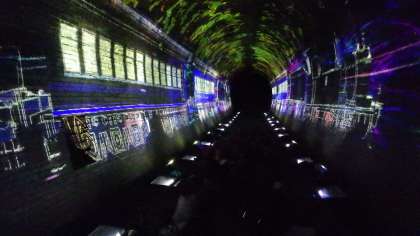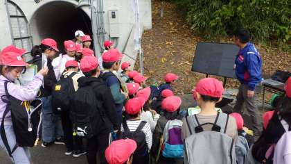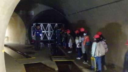 地滑りを防ぐために、地下の水を流せるトンネルの中を見学しました。昔に地滑りが起きた時に下敷きになった当時のトンネルが保存されていて、プロジェクションマッピングを見せていただきました。