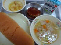 今日は、 ・コッペパン ・牛乳 ・さかいのたまねぎスープ ・ハンバーグ野菜ソー...