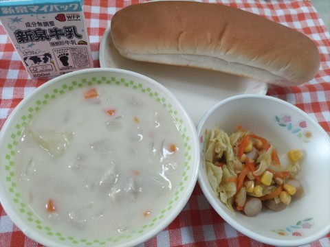 『ホットサラダ』『クリームシチュー』にコッペパン・牛乳です。