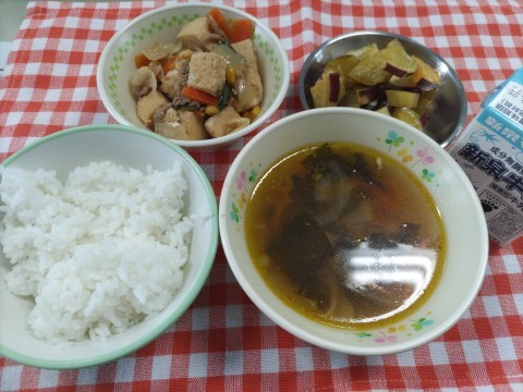『厚揚げの中華煮』『焼き大学いも』『わかめスープ』にご飯・牛乳です。