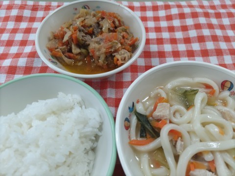 『豚肉のゴマ風味』『鶏塩うどん』にご飯・牛乳です。