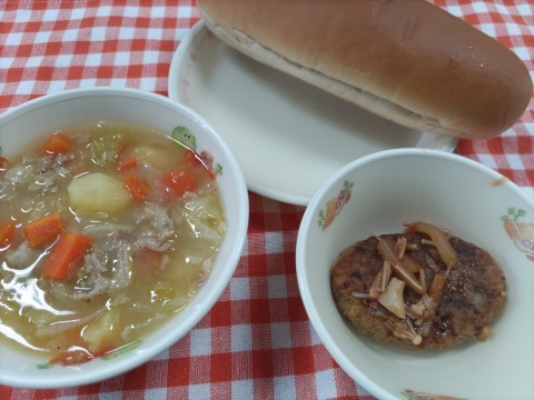 『ポトフ』『ハンバーグきのこソース』に黒糖パン・牛乳です。