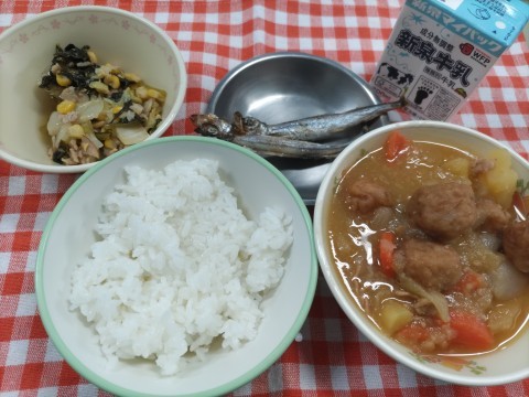 『小松菜と白菜の炒め煮』『焼きししゃも』『豚肉と野菜の生姜煮』にご飯・牛乳です。