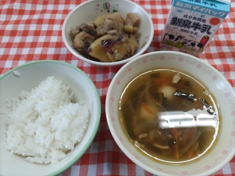 『鶏肉とさつまいものピリ辛煮』『にらとうずら卵のスープ』にご飯・牛乳です。