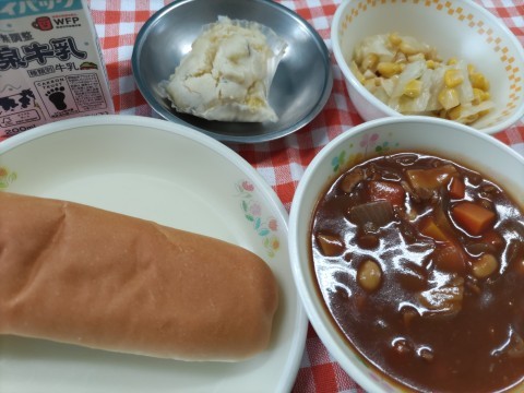 『ビーンズシチュー』『コーンキャベツ』『さつまいもケーキ』にミニコッペパン・牛乳です。