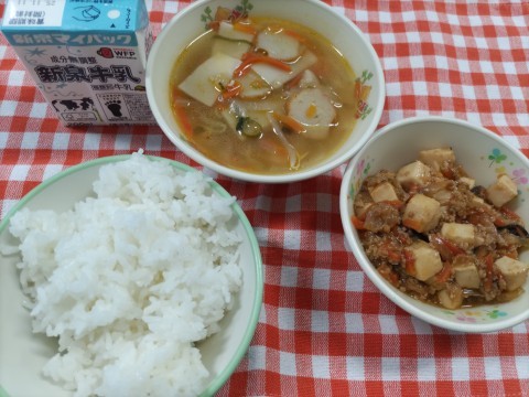 『ワンタン』『麻婆豆腐』にご飯・牛乳です。