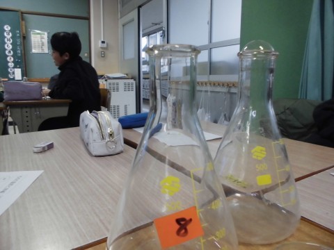 右側の三角フラスコの上の方・・・なんだかふくらんでいませんか??