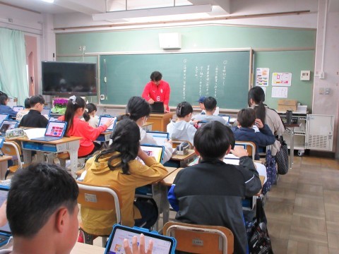 6年1組がタブレットのセットアップ作業に