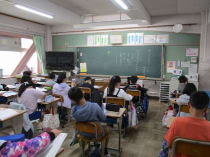 1・2組とも国語。教材名:思いやりのデザイン。めあて:自力学習をしよう。新しい教材に向かうとき、まず、自力学習において、自分で意味調べや漢字の読み方、問いと答えなど調べます。