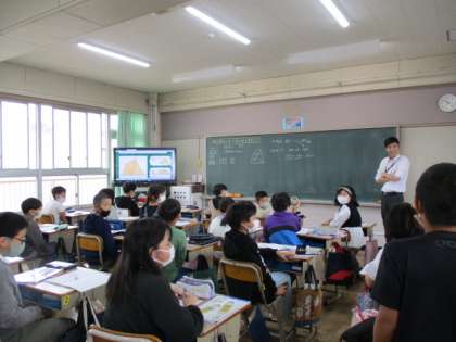 2組は算数。単元名:図形の合同と角。めあて:四角形の4つの角の和を考えよう。図形に線を入れて、話し合いました。