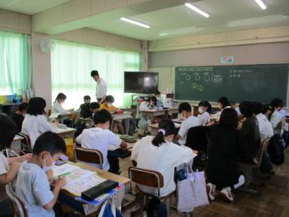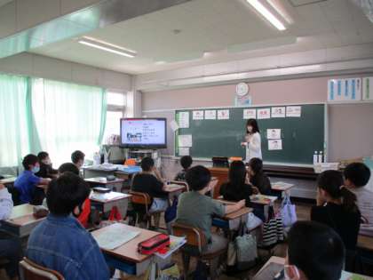 1組は英語。めあて:自己紹介を英語でしよう。内容は、挨拶、自分の名前、好きなものなどを話します。