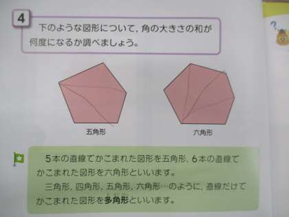 2組は算数。単元名:図形の合同と角。めあて:五角形、六角形の角の和を考えよう。昨日、四角形の内角の和を補助線を引いて求めました。同様の方法をしてみましょう。