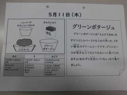 今日の給食は,黒糖パン,牛乳,グリーンポタージュ,ハンバーグ野菜ソースかけでした。