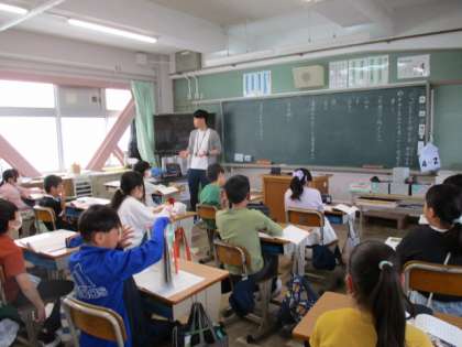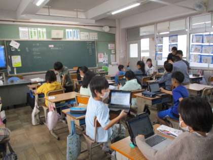 2組は国語。教材名:アップとルーズで伝える。めあて:筆者の使っている表現の工夫を見つけて感想を書こう。説明文なので、読み手に分かりやすく書いていますよ。