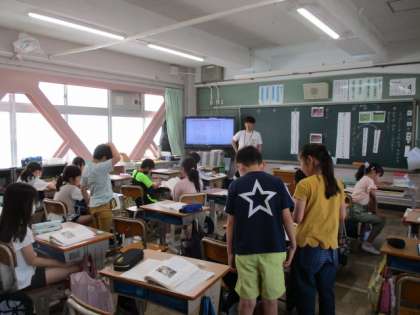 1組は理科。単元名:天気と1日の気温。めあて:天気による1日の気温の変化を調べよう。