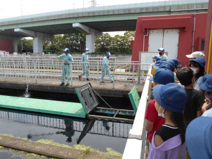 石津水再生センターに行きました。排水溝に流れた水は、下水道処理場に流れます。石津水再生センターでは、汚れた水をきれいにするところを見せてもらいました。下水処理の始めの方は、水がかなりにごっていました。でも、下水処理の終盤の最終沈殿池では、水が透明になりきれいになっていることが分かりました。子どもたちは、「かなりきれいになっている。」「すごい!」など、思わず感想を呟いてしまうほど、驚いている様子でした。