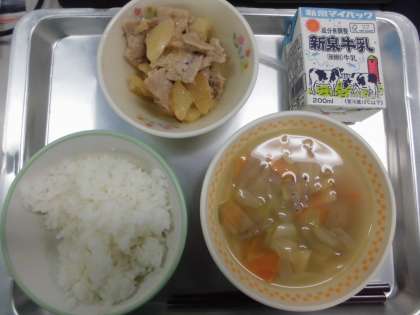 今日の給食は,ごはん,牛乳,塩ちゃんこ汁,豚肉のみそマヨガーリック焼きでした。