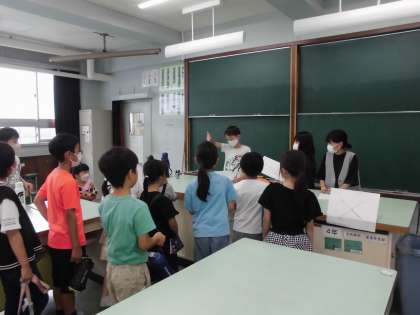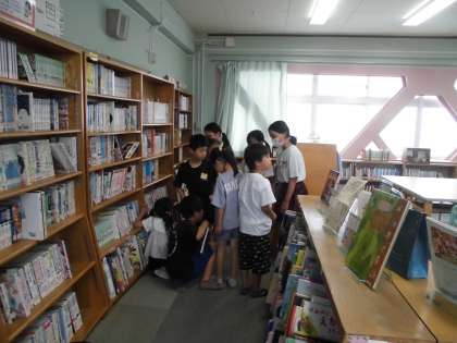 理科室は〇×クイズ、図書室は本探しゲームをしました。