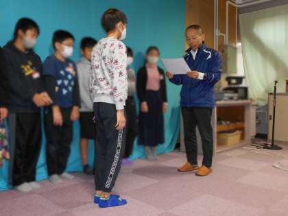 委員会の認証式がありました。各委員会の委員長が委員会で頑張りたいことを発表してくれました。代表で代表委員の子が認証賞をもらっています。