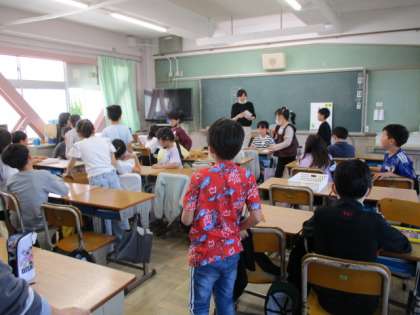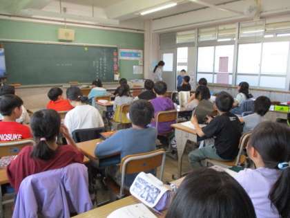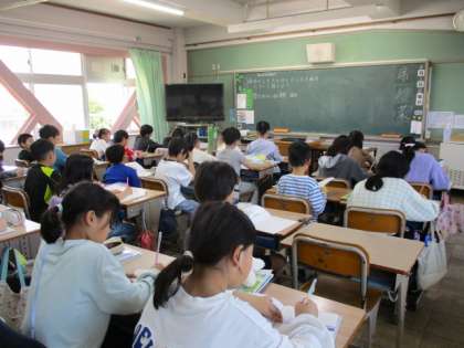3組は国語。教材名:力を合わせて ばらばらに。テーマから思い浮かべたものの特徴を聞き合って予想します。