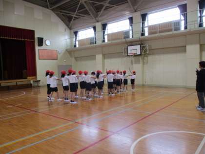 3組は体育。整列の練習と体ほぐしの運動。鬼ごっこをしました。