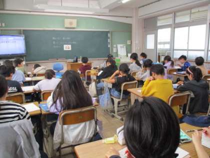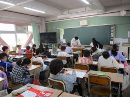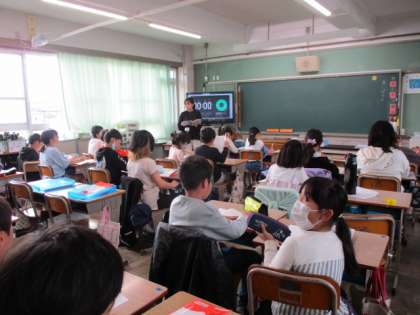 1・2組は算数。宿題の答え合わせ。学年が上がるにつれ内容が高度になります。理解しづらい問題等あれば、いつでも先生や友だちに尋ねましょう。