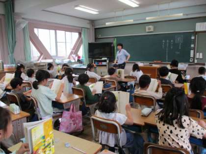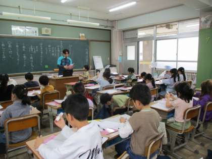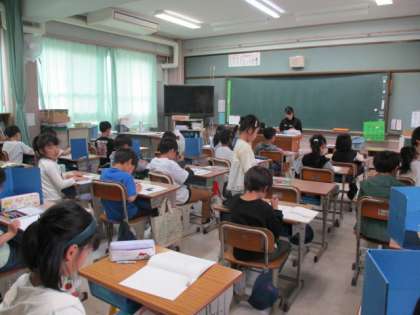 1・2組とも国語。新出漢字 南 の練習をした後、教材「ふきのとう」の学習をしました。初めて読む教材なので、お手本の音声を聞きました。