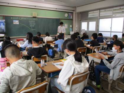1組は社会。単元名:日本国憲法と政治の仕組み。めあて:日本国憲法と福祉プラザのつながりを考えよう。そもそも日本国憲法はなぜつくられたのでしょうね。