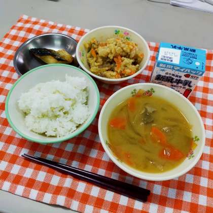 ご飯、さつま汁、サバの塩焼き、卯の花、牛乳