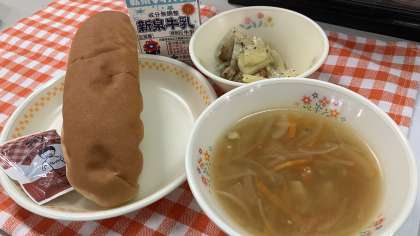 コッペパン、チョコレートクリーム、オニオンスープ、じゃがいものバジル焼き、牛乳