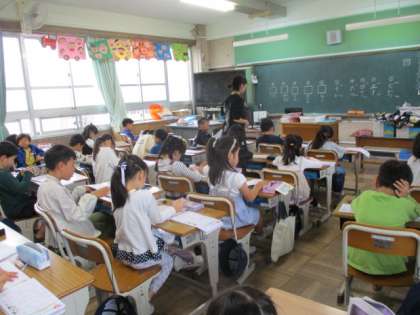 1組は国語。漢字ドリルで力試しのページをしました。どれだけ覚えているか試しました。