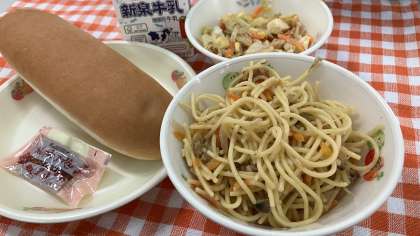コッペパン、きのこスパゲティ、豆腐サラダ、メープルシロップ、牛乳