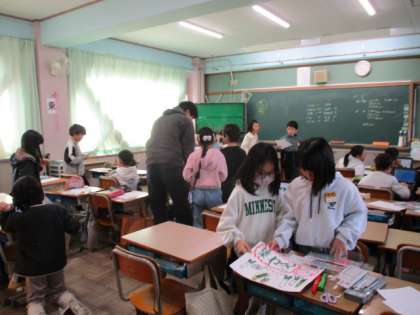1・2組は総合。めあて:明日の平岡子ども店開店準備をしよう。明日は2回目の平岡子ども店開店の日です。子どもたちはよくここまでこぎつけました。前回の店の経営を振り返り、改善点を出し合い、明日の店でそれを実行にうつします。