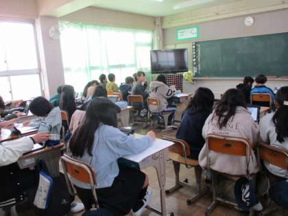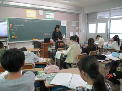 1組は英語。めあて:サンタがどこにいるのか、その道順を伝えよう。高学年になれば、「書く」「読む」も入ってきます。